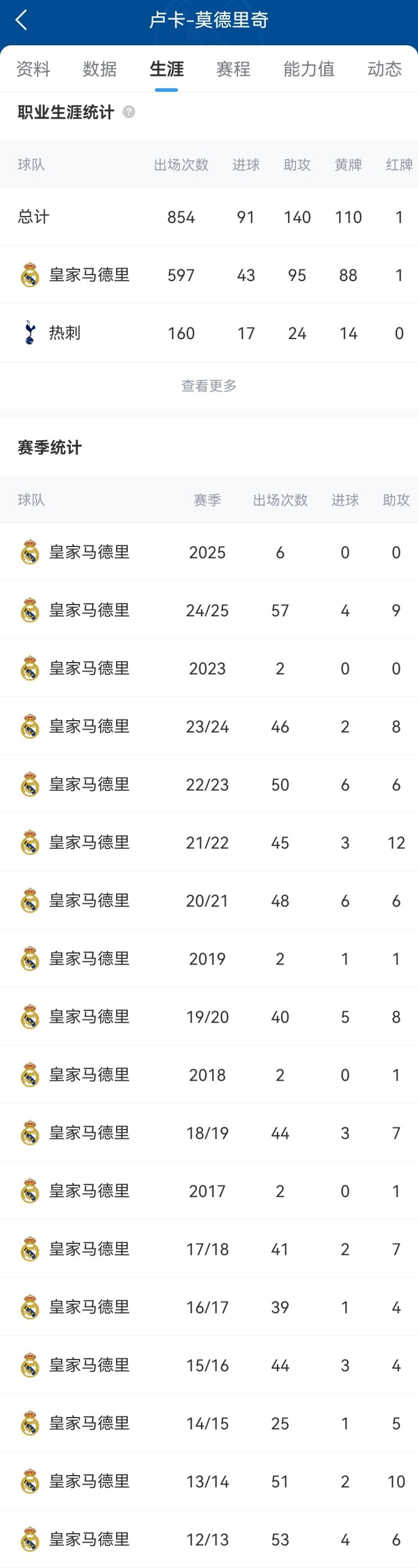 莫德里克(Modric)于2012年加入了皇家马德里(Real Madrid)。他在13年内进行了597场比赛,打进43球并协助95次比赛,帮助球队赢得28冠军奖杯:6个冠军联赛,6个俱乐部世界杯,5个欧洲超级杯,4个La Liga,2杯杯,2杯德尔·埃尔·雷伊和5个西班牙超级杯。